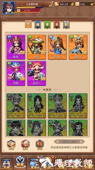 2、接下来是阵容,游戏中分为魏、蜀、吴、群等四个阵营,而武将的品质也有区别,按照高低品质来排的话,分别是神、黄、红、橙、紫,神级武将最为强力,但是获取也很困难