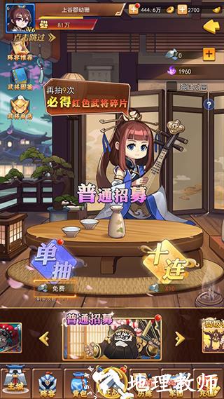 玩家在主城页面点击酒馆即可进入招募页面,每天都可以免费招募三次,也可以使用道具杜康进行战将的招募。