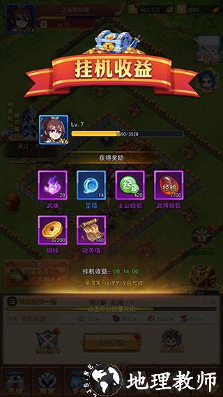 5、通关后可以获得奖励,平常关卡的话是随机掉落武将碎片,大量金币和升级装备用的武魂,BOSS关卡和限定活动关卡会掉落更稀有的奖励,可能还有限定的成就奖励以及称号