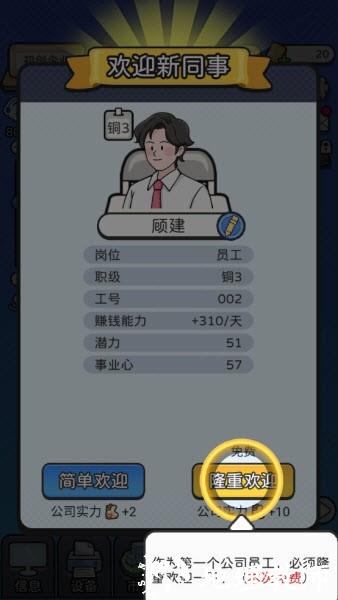 3、创意道具:有 “人才雷达” 等四类道具,可招募隐藏人才、抵消失误影响、获策略建议、保护公司。