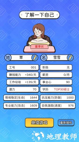 1、进入游戏首先是选择自己的角色身份,每个人物的属性都不一样,可以点击右下角的重新随机更换人物,选择好后点击继续游戏。
