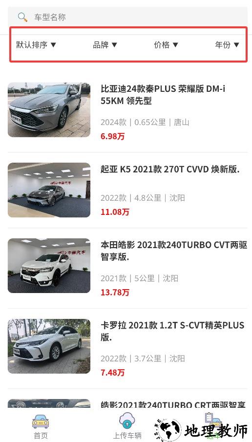 4、选车中心支持按品牌、价格、年份及默认排序等多维度条件精准筛选。