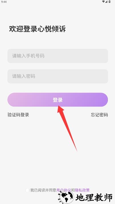 2、返回登录界面输入手机号码和登录密码,勾选同意协议后点击登录按钮进入。
