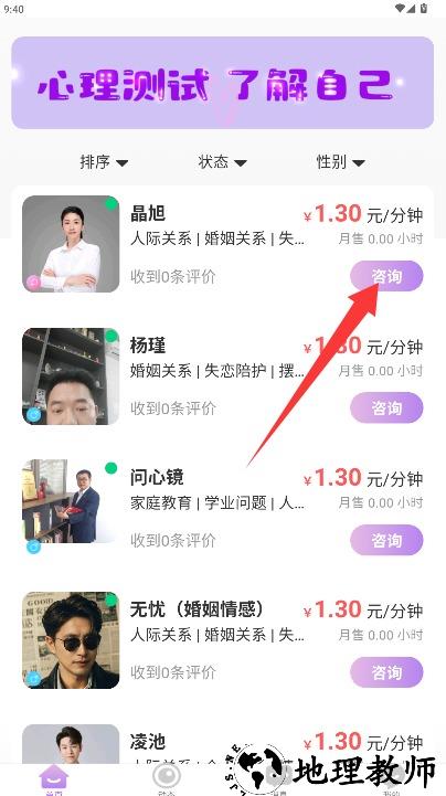 3、进入首页浏览系统推荐的心理咨询师列表,根据专业背景选择适合的咨询师。