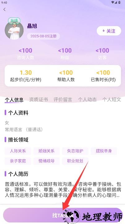 4、在咨询师详情页面查看资质与擅长领域,点击倾诉功能即可开始咨询对话。