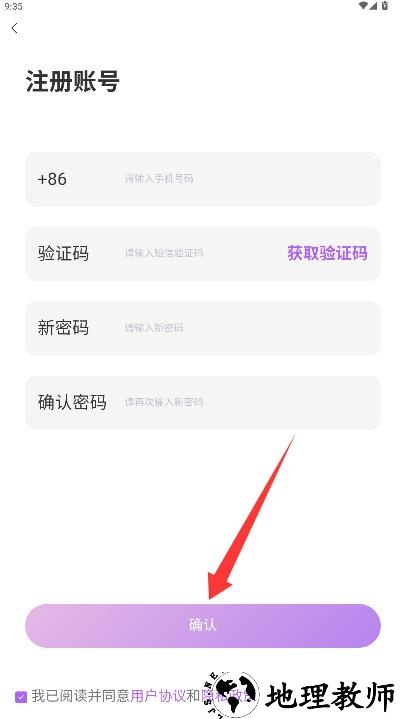 1、输入手机号码和验证码并设置密码,勾选同意协议后点击确认完成注册。