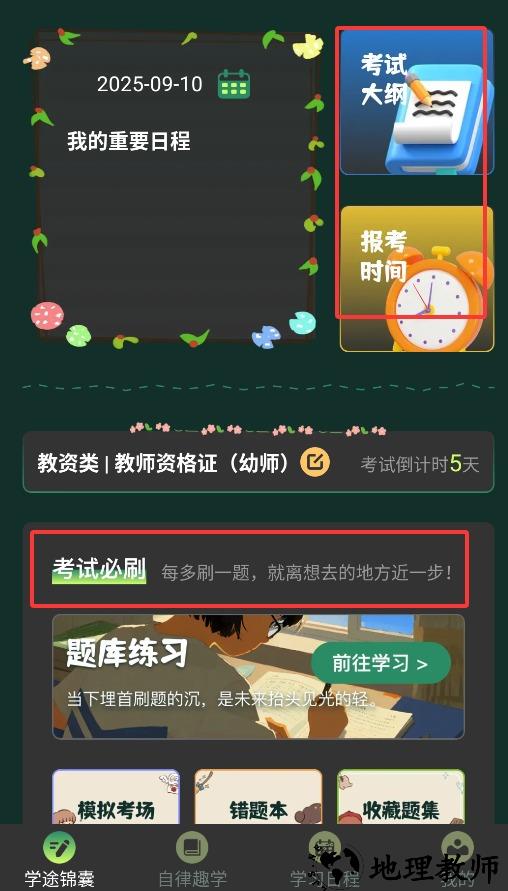 2、考试时间管理:内置全国教师资格考试时间数据,自动进行报考与考试日期倒计时,支持定制备考周期。