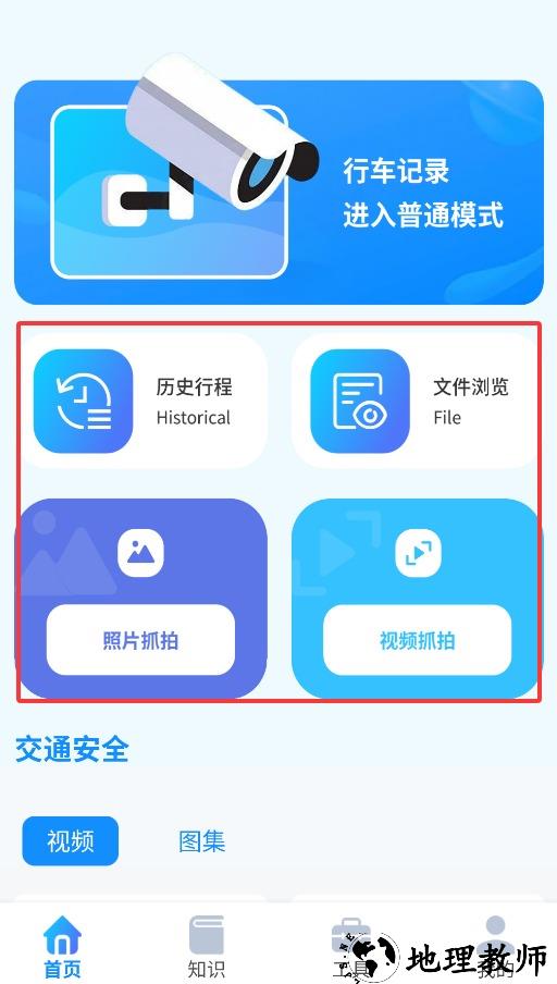 2、首页提供历史行程查询、文件管理及实时视频/照片抓拍等行车记录功能。