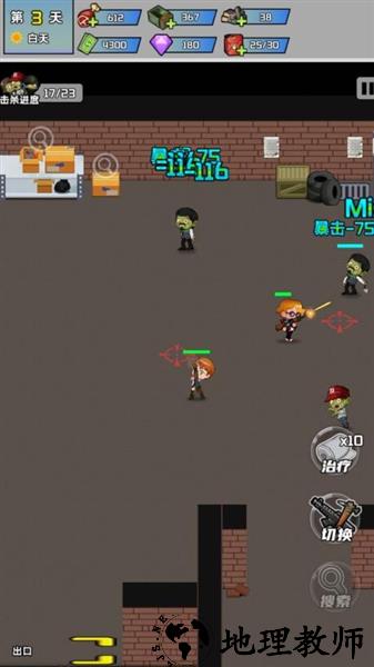 2、继续战斗过程中,注意角色攻击伤害数值(如-75)和暴击提示(如暴击-75),合理走位躲避僵尸攻击。