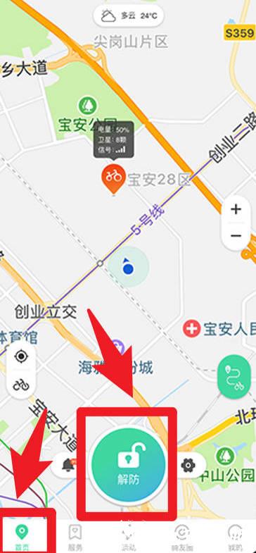 2、在首页可以通过解防按钮一键解锁爱车,实时掌握车辆状态,骑行更方便。