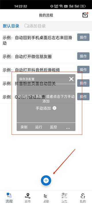 1、启动程序后进入流程界面,点击添加按钮将弹出悬浮窗。若未正常显示,需按系统提示开启悬浮窗权限。