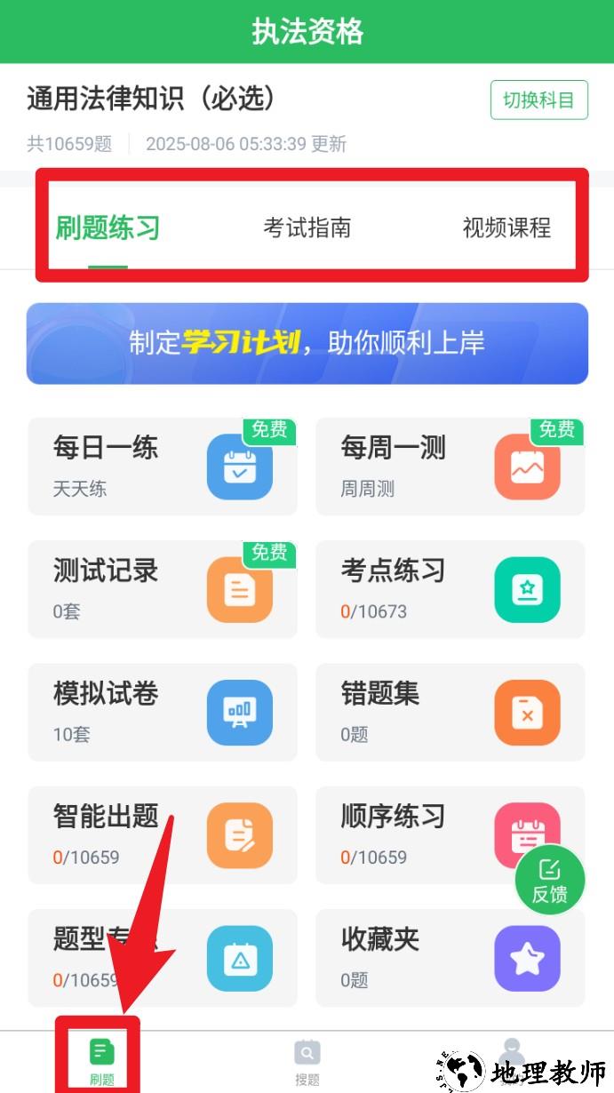 1. 进入首页点击下方刷题按钮,可查看每日一练、考点练习、模拟试卷等模块,自主选择练题方式。