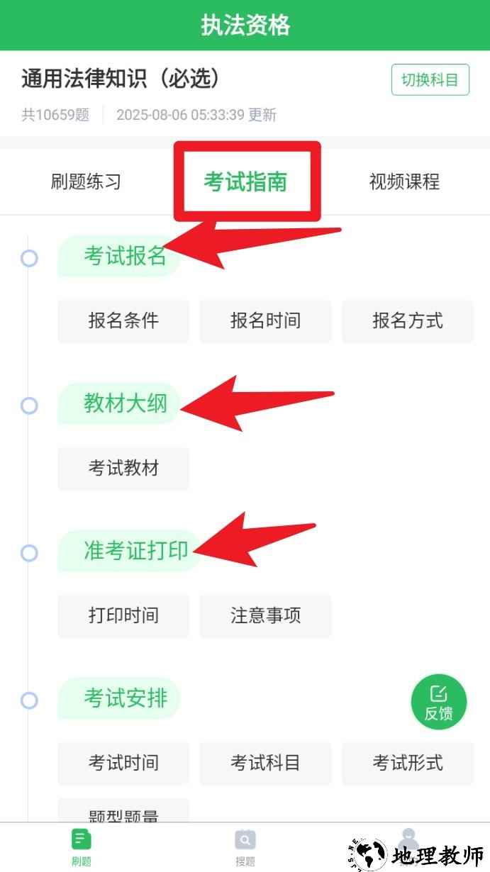 2. 切换至考试指南页签,了解考试报名、教材大纲、准考证打印等相关内容,快速掌握考试流程。