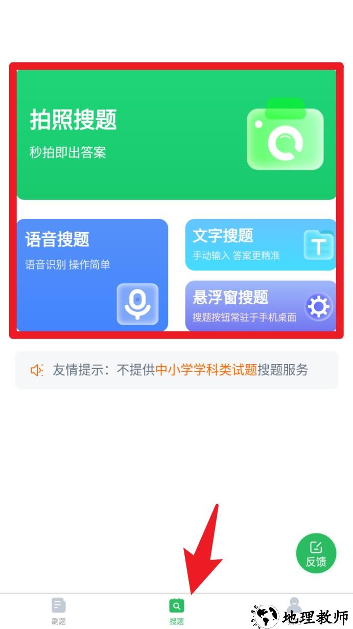 3. 点击底部搜题,可通过拍照、语音或文字方式快速搜索题目,支持悬浮窗搜索,查题更高效。