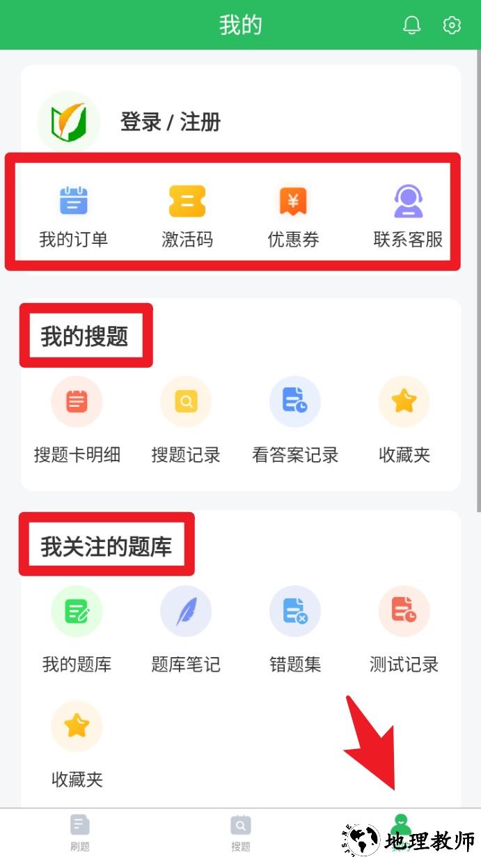 4. 进入我的页面,管理订单、激活码与客服服务,同时可查看我的题库、错题集及搜题记录。