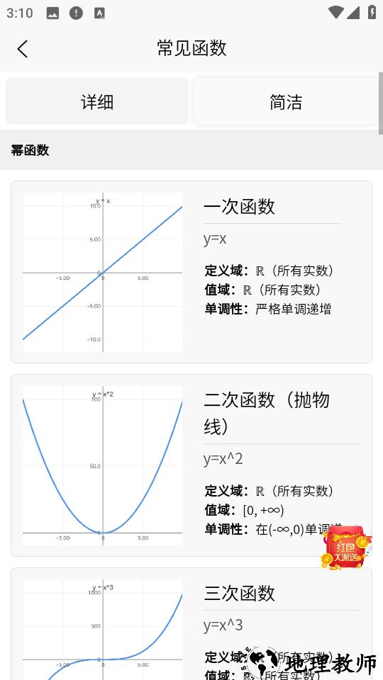 2、在主界面中找到 “常见函数” 模块并选择,浏览常用函数的图像与性质。