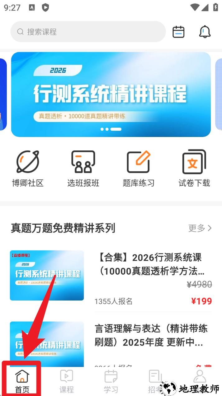1. 进入首页标签页,可查看推荐课程、专题活动、热门真题精讲等内容,快速找到当前复习重点。