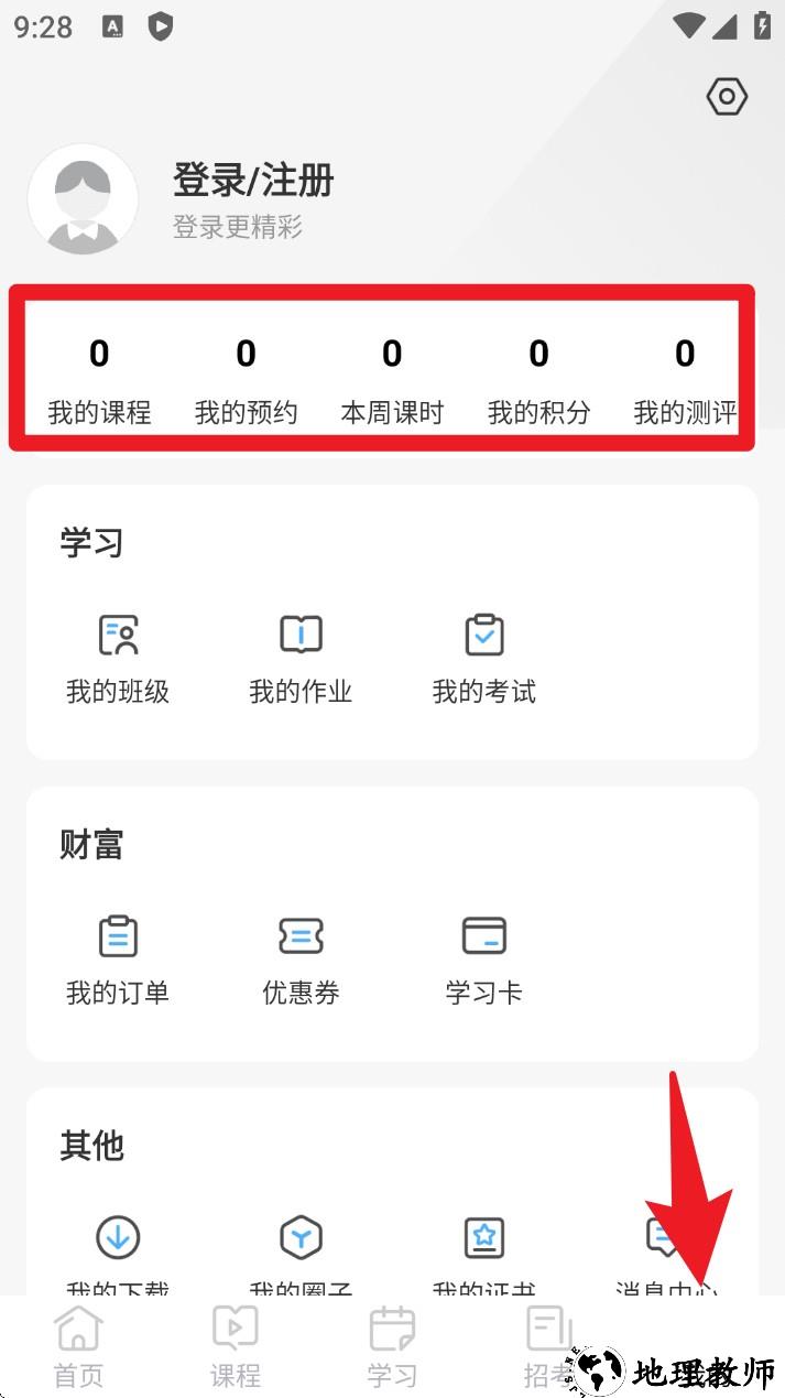 5. 进入我的”页面可查看课程进度、班级作业、考试安排,还能使用优惠券、下载证书等常用功能。