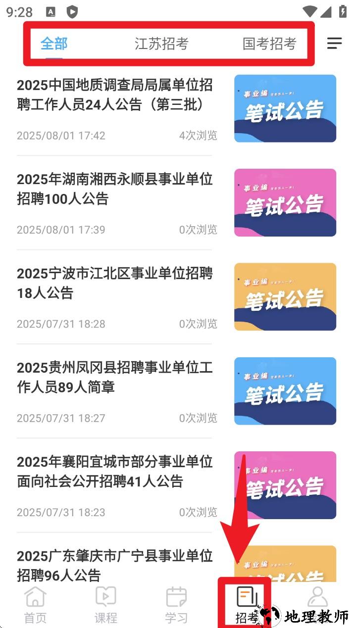 4. 打开招考页面能及时查看各地招录公告,支持分类筛选国考、地方考,掌握最新招聘信息。