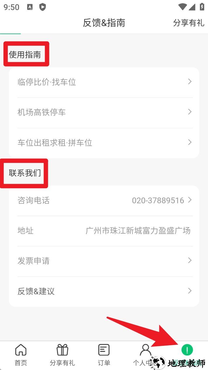 5. 如需查看帮助或联系客服,在底部导航点击个人中心并进入反馈指南,可查看使用指引、开票地址等信息。