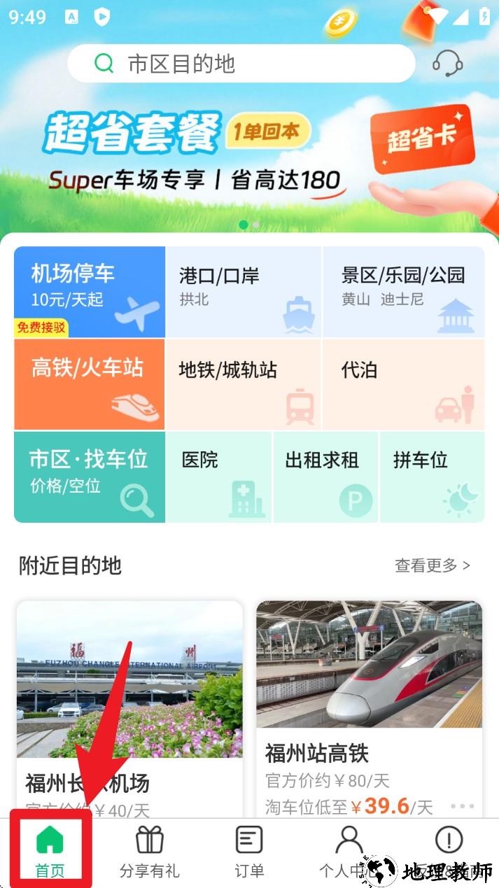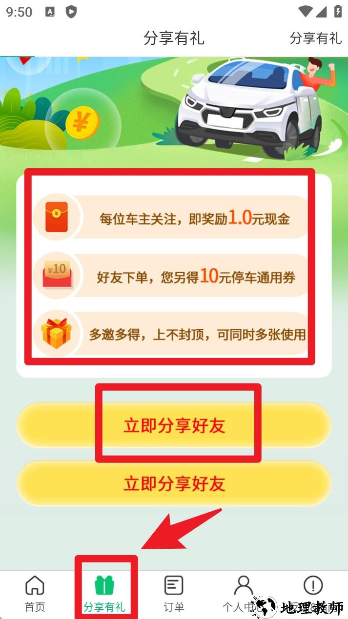 4. 点击底部导航栏分享有礼,可邀请好友注册停车位,好友下单后你将获得奖励停车券与现金红包。
