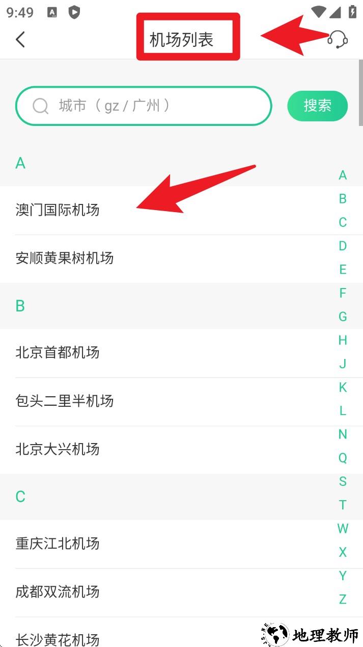2. 点击机场停车后会进入机场列表,下方按字母分类查看机场名称,点击即可查看该机场的停车详情。
