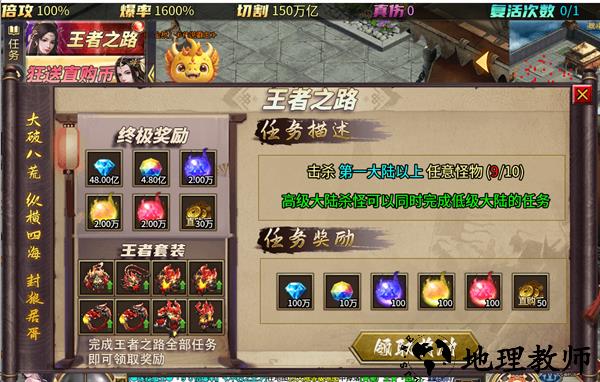完成王者之路全部任务即可领取奖励,前期我们需要提升的都有对应的NPC围绕每个大陆的安全区,利用我们领到的材料全部升满即可进入下一大陆 材料不够了怎么办,直接下图打怪 所有提升材料都可以打怪获得!爆率超高!