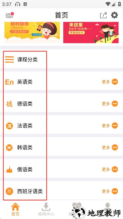 3、进入首页模块,能看到课程分类板块,该板块提供多种语言相关课程;
