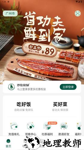 1、打开沙拉食刻软件,首页可见【吃好饭】与【买好菜】选项;若想吃饭点击前者,还可查看充值有礼等功能;