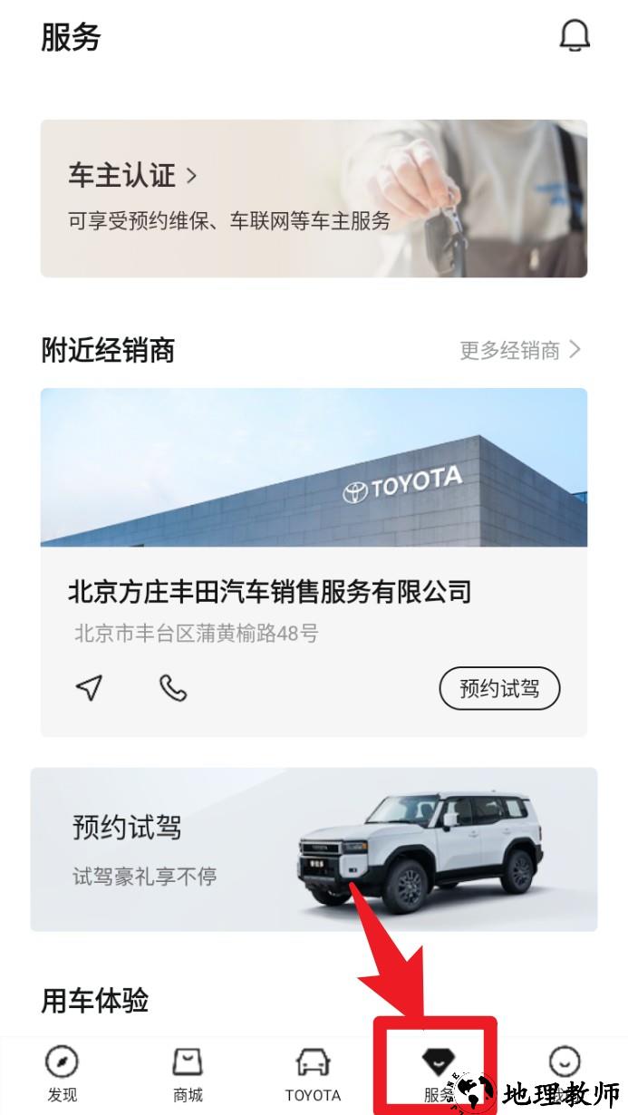 4. 在服务页面中,可进行车主认证、查找附近经销商、预约试驾等操作,方便快捷地安排售前售后服务。