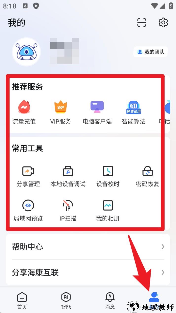 3. 登录成功后点击底部菜单栏的我的,可进入个人中心,管理推荐服务、常用工具、设备调试与设置选项。