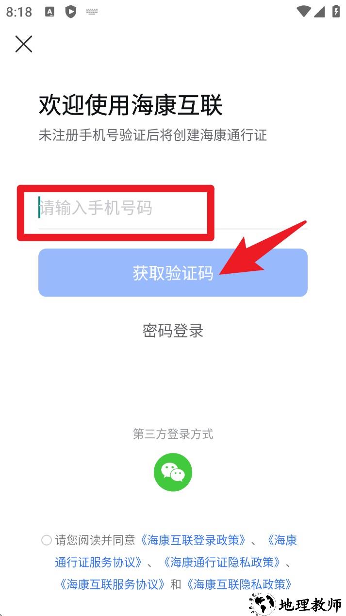 2. 进入登录页后,输入手机号并点击获取验证码,完成短信验证即可注册或登录账号,无需提前绑定权限。