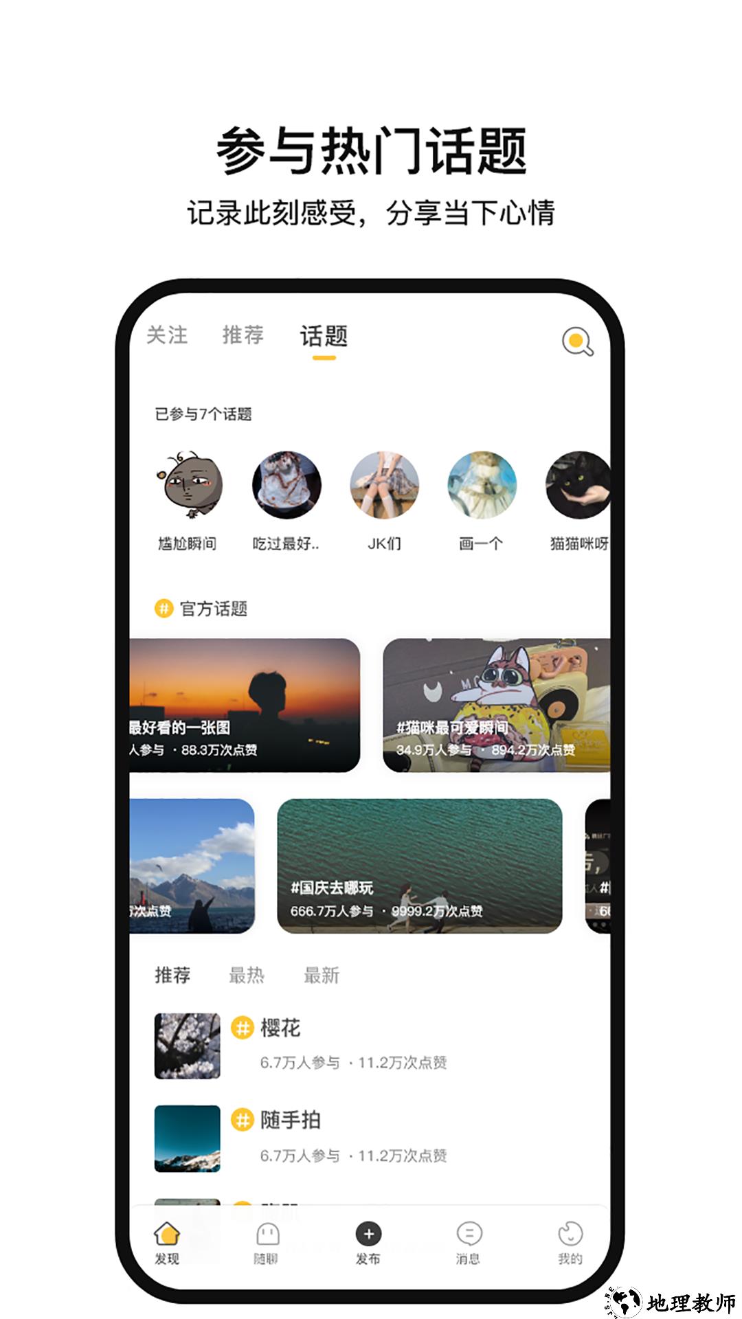 【发现】记录精彩动态,捕捉美好瞬间。丰富话题广场,秀出真实一面,不一样的内容 风格,总能遇到和你爱好相同的人!给您更新颖的图文音视体验!