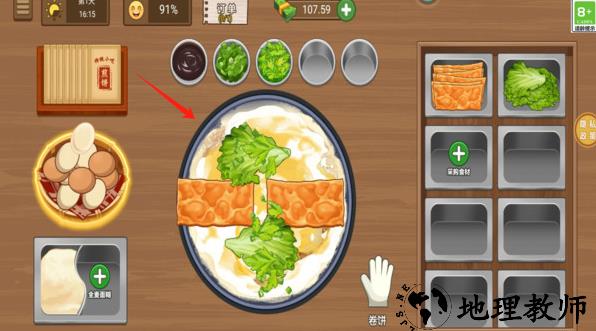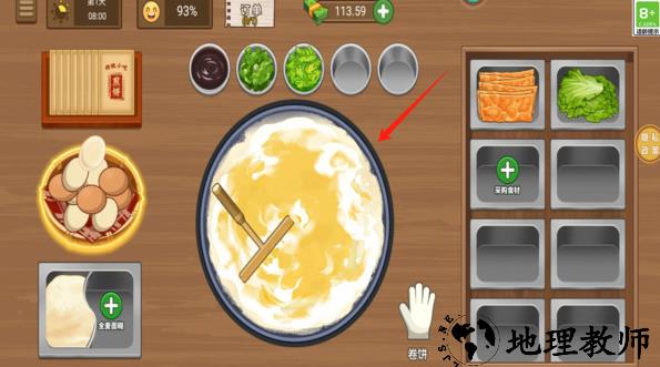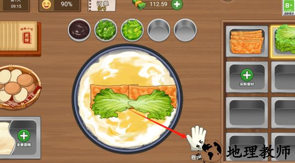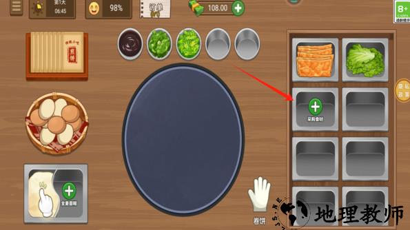 1、首先你需要点击采购食材将煎饼摊的空白处都填满