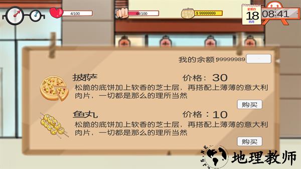 3、当体力能量不足时需要到商店买免费的便当、披萨、鱼丸来补充体力和精力。