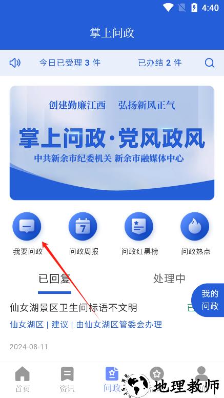 5、找到 “问政” 板块并点击进入,在此可提交提问、投诉等诉求,反馈相关问题。