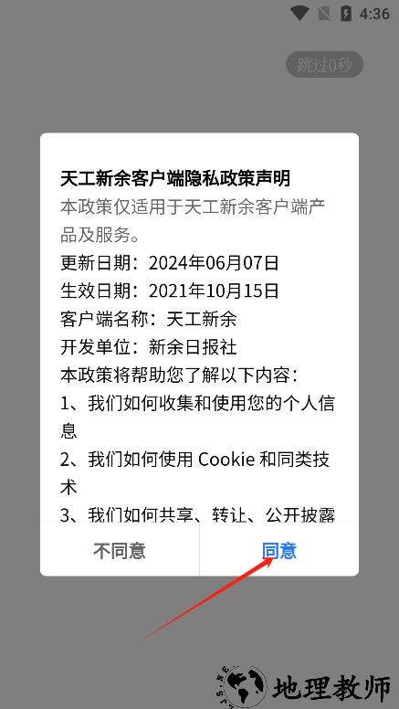 2、进入应用后,仔细阅读用户协议,确认同意后继续操作。