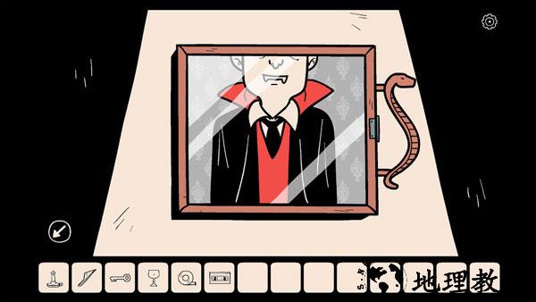 现在可以打开最后一扇柜门了,从里面得到一只螺丝刀,还有一瓶红酒。如今有了螺丝刀,便可以拆除吸血鬼画像画框上的螺丝钉了。就在两颗螺丝钉都掉落之后,突然你看到画中的事物变了,吸血鬼变成了那个留着长发的女孩,她的一只胳膊从画中伸出,想要抓住你。你下意识的用手挡住脸,但没有感觉到什么。你再次看向那幅画,并没有什么长发女孩,仍旧是那个吸血鬼。打开画,那后面是个图案迷题。你想到了告示板后面的大蒜十字架什么的,那些不就是和吸血鬼有关的东西吗?你按照顺序先拿出了大蒜,吸血鬼害怕地用披风挡住了脸,同时画上出现了右边三角是黑色的图案。下一个东西是杯子,空杯子对他没有效果,你把红酒倒了进去,再拿给吸血鬼,这时他的嘴角出现一抹红色,然后伸手在玻璃上画了个红红的X,这应该代表构成方块的四个三角都应该是白色的。下一个是十字架,画上出现了左右三角是黑色的图案。最后是镜子,它映不出吸血鬼的身影,于是画上只出现左边和下方三角是黑色的图案。把四个图案输入画后的迷题中,听见了正确的响声,拉动把手,露出了后面的开关。