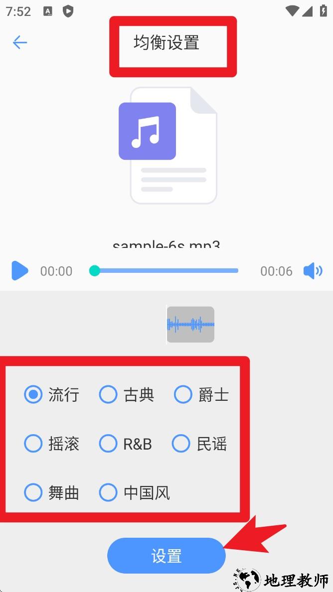 3. 点击均衡设置,可选择流行、古典、R&B 等多种风格,调整后点击下方设置完成保存。