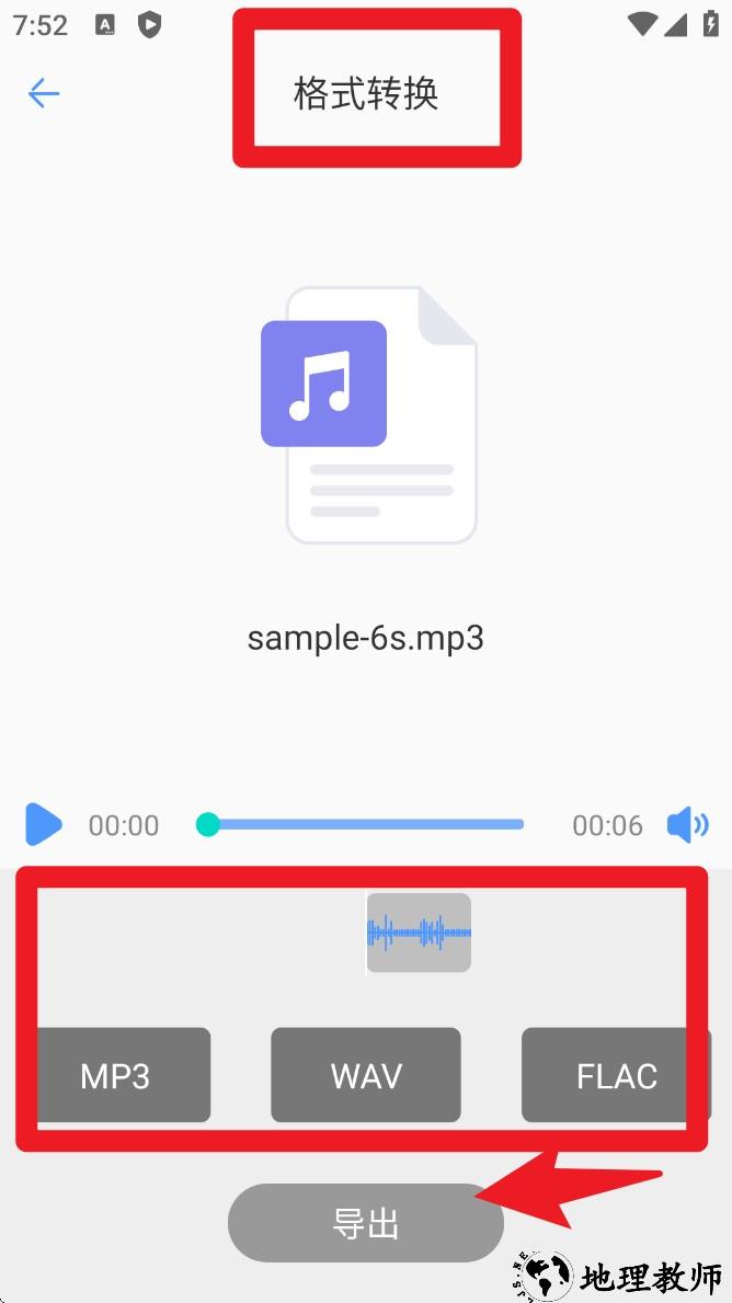 2. 选择格式转换,导入音频后点击下方的 MP3、WAV、FLAC 三种格式进行转换。
