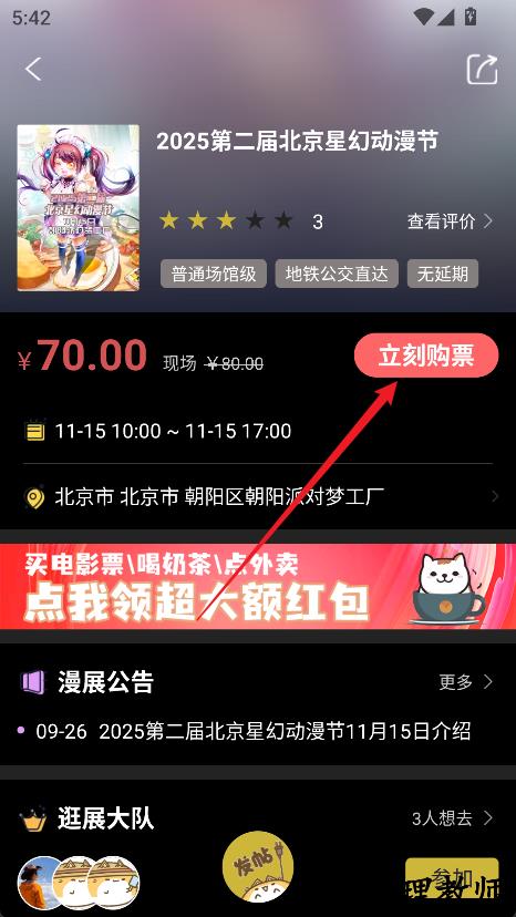 3、点击对应漫展活动的入口,在活动详情页中选择 “购买门票” 选项,按提示完成购票。
