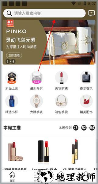 1、下载安装会订货商城,打开软件进入首界面,可在下图箭头所指位置搜索心仪商品。