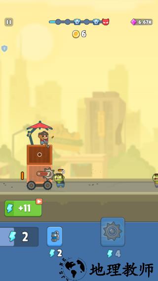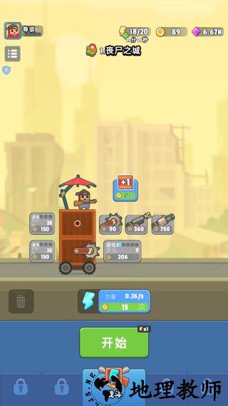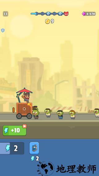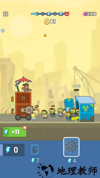 1、在关卡中,战车会自动前进,角色会对来袭的僵尸发起进攻,击杀获得金币。