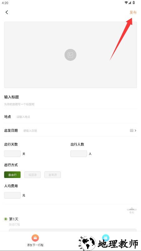 3、填写行程名称、目的地、出发时间等详细信息,确认无误后即可发布出行方案。