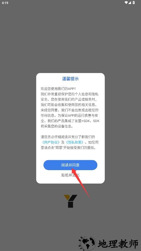 1、初次使用需阅读平台服务条款与隐私政策,确认后点击阅读并继续按钮进入应用。