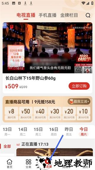 3、看直播页提供电视直播内容,展示长白山林下 15 年野山参,509 元可购 12 盒,直播商品有 9 元抵 158 元等优惠券,支持查看不同日期直播。