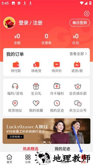 4、我的页面可完成登录注册,能查看余额、优惠券,管理待付款等订单,还设有福利咨询、生日礼等功能,热卖精选含大牌打底衣。