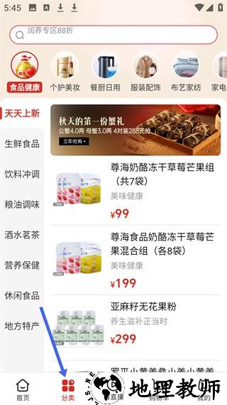 2、分类页涵盖食品健康、个护美妆等品类,食品健康类包含生鲜、粮油等细分项,还有秋天的第一份蟹礼等特色商品推荐。