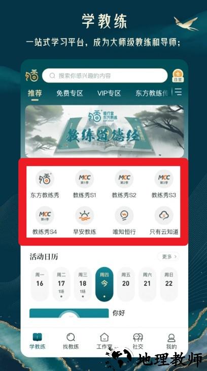 1. 进入学教练专区,点击教练秀、早安教练等内容板块,系统推荐适合你的学习资源。