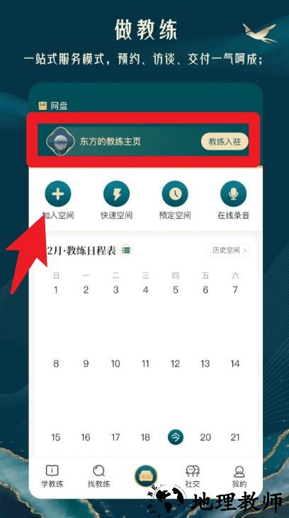 2. 切换到做教练页面,可加入教练空间、快速预约教练时间,并支持在线录音记录。